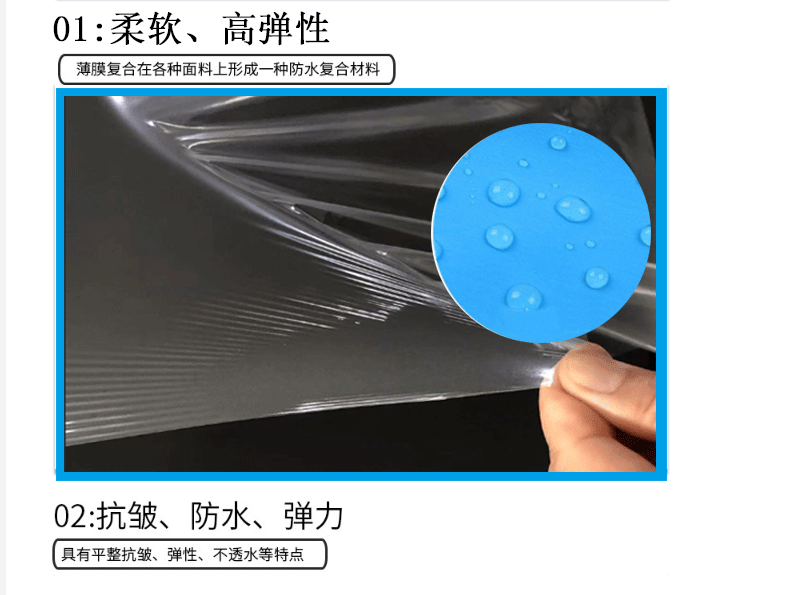 柔軟。耐沖性高,伸長率大,拉伸性優。透明性能優良,防水透氣,無毒環保。